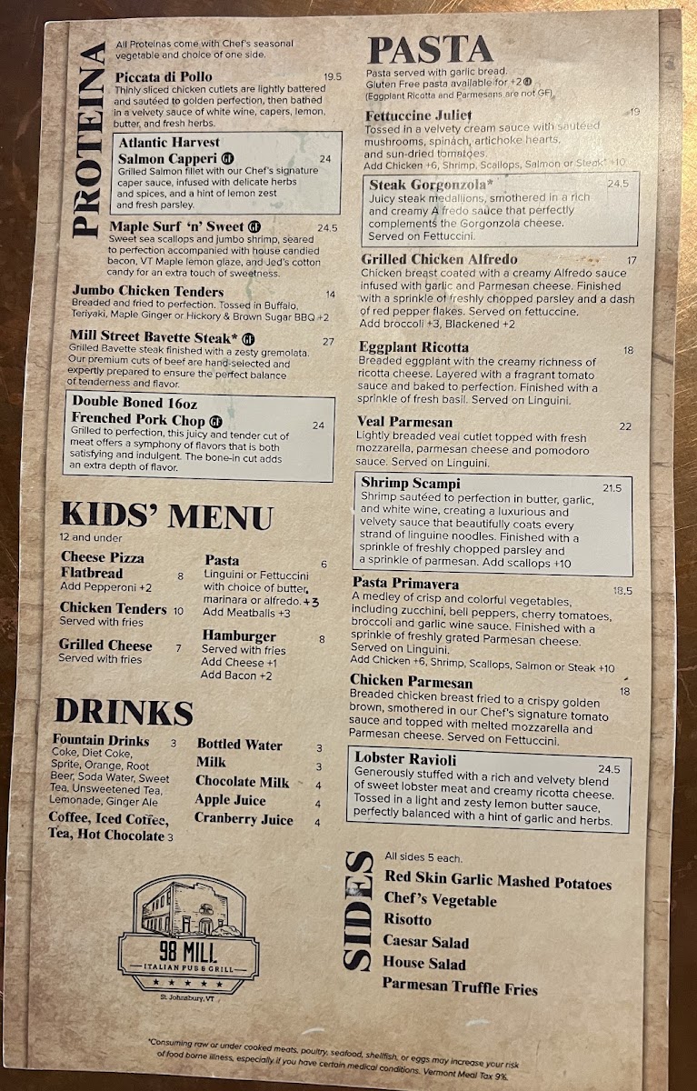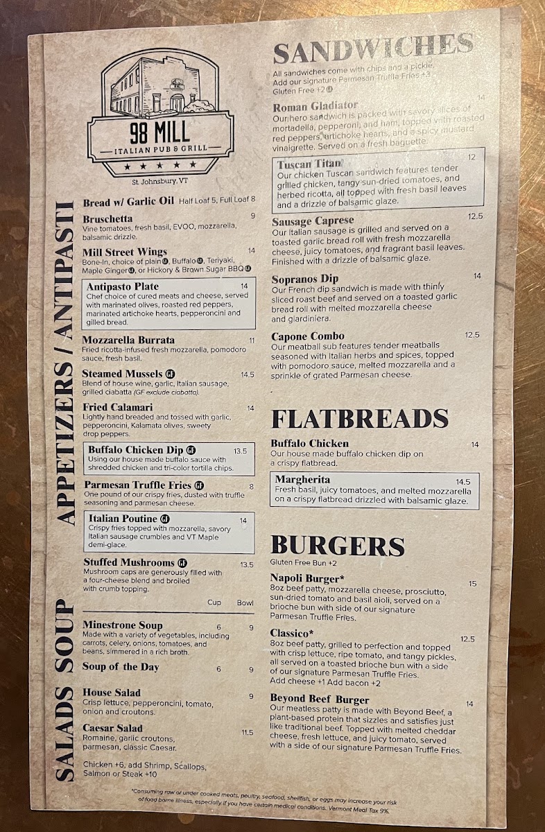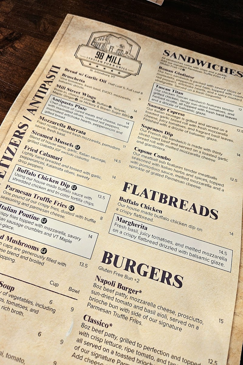 As a final takeaway, the menu at 98 Mill leaves a strong impression through its thoughtful balance of Italian-inspired comfort food and modern American favorites. From the very beginning, the appetizer selection sets the tone, with crowd-pleasers like Bruschetta, Bread W/ Garlic Oil, Mill Street Wings, Antipasto Plate, and Mozzarella Burrata offering familiar flavors that are executed with care and simplicity. These starters ease diners into the experience and reflect a kitchen that values quality ingredients and classic preparation.
